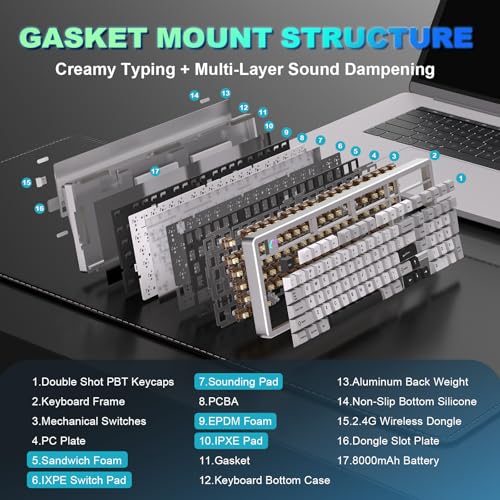 - Tri-Mode Connectivity & Extended Battery Life: YUNZII AL98 wireless gaming keyboard features versatile tri-mode connectivity (Bluetooth 5.0/2.4GHz/USB-C) with seamless switching between up to 5 devices and and multiple systems (including Windows, Mac, Android, etc.). A built-in 8000mAh battery delivers exceptional endurance for both extended work sessions and immersive gaming, this wireless keyboard can free you from frequent charging interruption